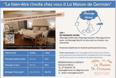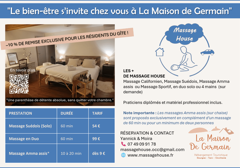 Parce que votre séjour à La Maison de Germain est une invitation à la déconnexion, nous avons noué un partenariat exclusif avec Massage House. Plus besoin de vous déplacer : Yannick et Moira, praticiens certifiés, viennent à vous avec tout le matériel nécessaire (table de massage, chaise ergonomique, huiles biologiques et musique relaxante) pour transformer votre chambre en un véritable sanctuaire de sérénité.