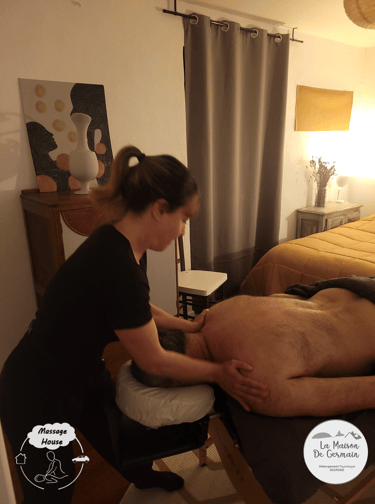 Parce que votre séjour à La Maison de Germain est une invitation à la déconnexion, nous avons noué un partenariat exclusif avec Massage House. Plus besoin de vous déplacer : Yannick et Moïra, praticiens certifiés, viennent à vous avec tout le matériel nécessaire (table de massage, chaise ergonomique, huiles biologiques et musique relaxante) pour transformer votre chambre en un véritable sanctuaire de sérénité.